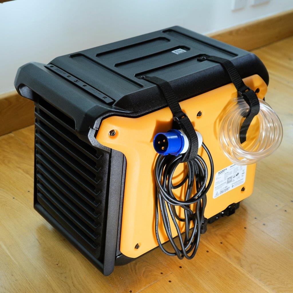 220V/50 Hz 475W 2.1A (R290 refrigerant). Floor standing on 120 cm with 2 wheels and drag folding handle. Stackable refrigerant dehumidifiers rotor moulded plastic casing with electronic controls. Side air outlet can be ducted to focus dry air. Over 43 litres maximum extraction at maximum temperatures and humidity. Power rated at operating range from 4°C up 40°C. Integral pump with maximum water height 3.5m. One fan speed with 330 m3 /hr air volume capacity. Sound rated at 50dB. Hose length 12m cord length 5m.